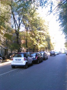 ミラノは、市内のゾーンによってかなり駐車が規制されている場合があります。私は今のところ運転はしないので良く知りません。駐車場に入れる車はごくわずかで、大抵は路上駐車です。それも、歩道にも乗り上げます。しかし、私は引っ越した地域でなんと中央ラインに堂々と駐車する車を見てビックリ。こういうのはあり?よく追突されないものだと思います。時間的に長い駐車かどうか知りませんが、多いときは写真のように連なって駐車されています。とても?な光景です。夜間は長い車の中央分離帯と化します。