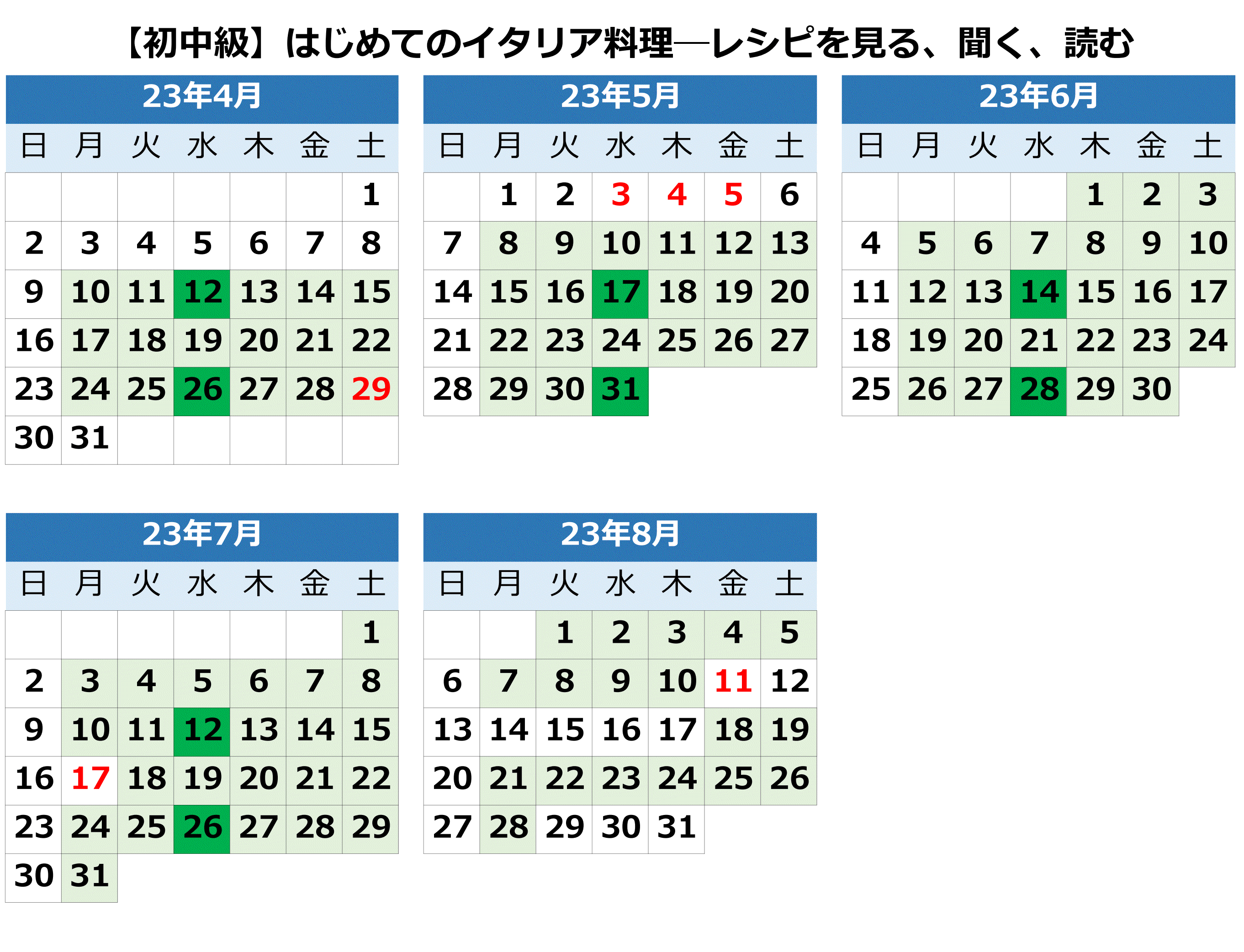 ![]() イタリア料理のレシピを楽しむ講座です。 基本となる料理用語を学び、料理のブログを読んだり、レシピのビデオを見たりして、イタリア料理の世界に親しみながら、イタリア語の力を伸ばしていきましょう。 |