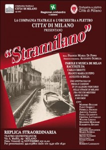 Stramilano e uno spettacolo teatrale con delle parti di musica e delle parti recitate. Le persone che c’erano ieri sono gli attori che recitano in dialetto nello spettacolo e che cantano accompagnati da noi.Le canzoni sono cantate in dialetto milanese, che e diverso dall’italiano. Alcune cose che dicono non le capisco neanche io!Per farti un’idea, pui guardare Staramilano”