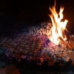 プリモがスパゲッティボンゴレ、セコンドは暖炉で車エビを炙って焼いたもの、スズキのワイン蒸し、野菜がブロッコリー葉炒め、レタスとケッパー・アンチョビ・黒オリーブ炒め、デザートはフルーツ入りビスケット(Roccocò)、チョコを塗した柔らかいビスケット(Mustaccioli)、最後はナッツ3種類を延々と食べるというものでした。