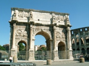 コンスタンティヌス帝は312年ミルウィウス橋の戦いにおいて、「暴君」マクセンティウスを破りますが、コンスタンティヌスはブリタニアから軍を発し、マクセンティウスはローマにいました。ローマの凱旋門の碑文によれば、記念門は「首都の解放者」としてコンスタンティヌスに捧げられました。この時すでにイタリアの都市としてのローマと世界帝国としてのローマの間に視点のずれが生じています。このあと324年までに帝国全土を統一しますが、330年にはコンスタンティノポリスを建設し、遷都します。