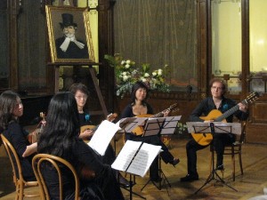 歌が多い中、マンドリン演奏は珍しかったこともあり、お客様は楽しく聞いて頂けたようでした。舞台と違い、大きな広間でお客様もすぐ近くに座っていらっしゃり、Verdiの肖像画を背に演奏することが出来、大変光栄な機会を得られました。