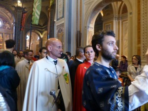 その後、教会での出陣式は見られるというので、その衣装をまとっての各コントラーダ(地区)の代表がその旗と紋章の衣装をまとって出陣する様子を見ることが出来ました。皆の熱気が感じられ、雨で中止になったのは市民だけでなく、参加者の彼らにとっても当然残念だったろうにとと思いました。