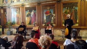 数日後、ミラノ音楽院と隣接している教会の奥の部屋でリュート四重奏のコンサートがありました。多分普段は入れない場所と思われます。リュートにふさわしいこじんまりした、これまたフレスコ画と絵画で囲まれた美しい部屋でした。その正面に用意された舞台は、その昔、このように音楽を楽しんだのではと思われ、その時代にタイムスリップする場面でした。