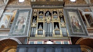 更に奥の部屋に移動。そこは、COROと呼ばれる教会主祭壇背後にある聖職者祈祷席の部屋でした。その部屋にもフレスコ画がびっしりで、2階には立派なパイプオルガンがありました。その日のコンサートはオルガンでしたが、まさかパイプオルガンとは思っておらず(教会ですからパイプオルガンなのですね)、期待に胸が高まりました。