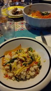 ある日の夕食だけ、私がお礼の意味で材料持参した「野菜の五目寿司」と「干しシイタケと素麺のすまし汁」を作って振る舞いました。イタリアのInsalata di riso と似ていますので、和食を食べたことのない彼女のパートナーも大丈夫だろうと。和食が好きで野菜系の彼女のことを思って作った五目寿司は好評でホッとしました。