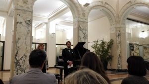 昨年から会員になった、毎月1回ミラノ市内の美術ギャラリーで開かれるクラシックコンサート組織「ムジーカ・ポエジア(Musica Poesia)」の新シーズン開始に伴い、プレゼンテーションがありました。会員のみのプライベートな催しで、スカラ座近くにある、大きな建物1階にある銀行のエントランスで開かれました。