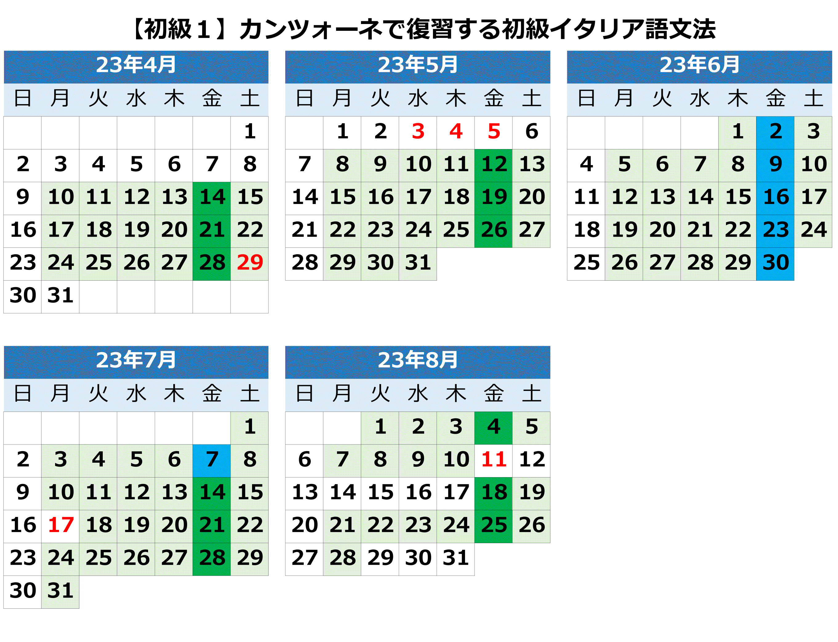2回の授業で1つのカンツォーネを取り上げ、歌詞の読解、ゲーム、練習問題などをやりながら、初級文法を楽しく復習します。